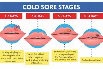 Let’s start with the basics. The flowchart schematic is a rough estimate of a HSV (Herpes Simplex Virus) outbreak. Note that any of the stages could be longer or shorter for any particular cold sore outbreak episode. The stages for an outbreak of genital herpes is about the same as a cold sore outbreak.